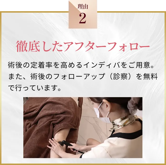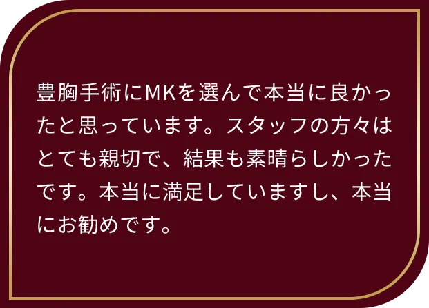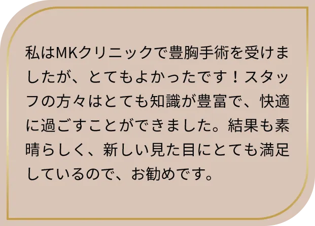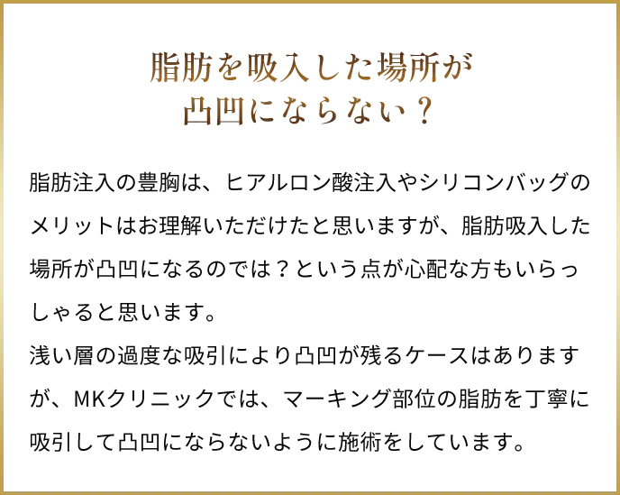 MKクリニックでは、しこりができる可能性を低く抑えています。まれにしこりができる場合がありますが、その場合はご相談いただければ、アフターケアをさせていただきます。