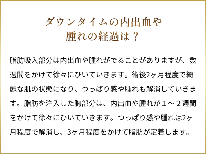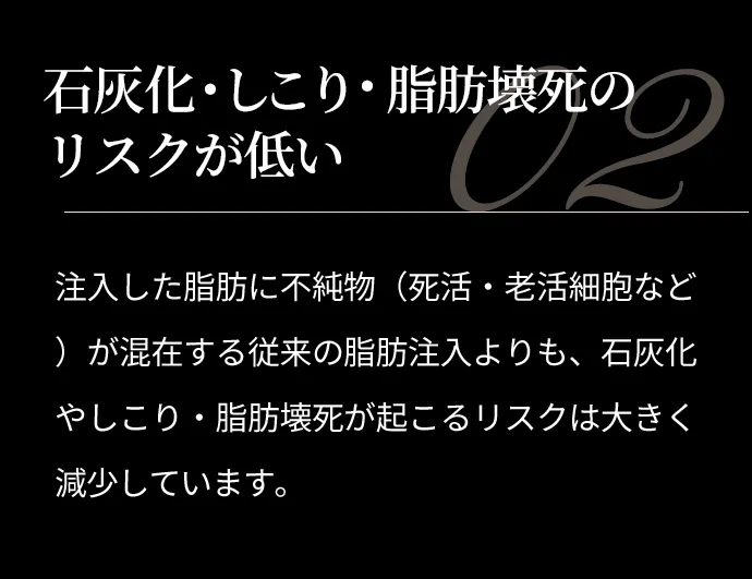 これらの脂肪は注入後に定着する 可能性が低く、定着しなかった場合 やがて排出されてしまいます。