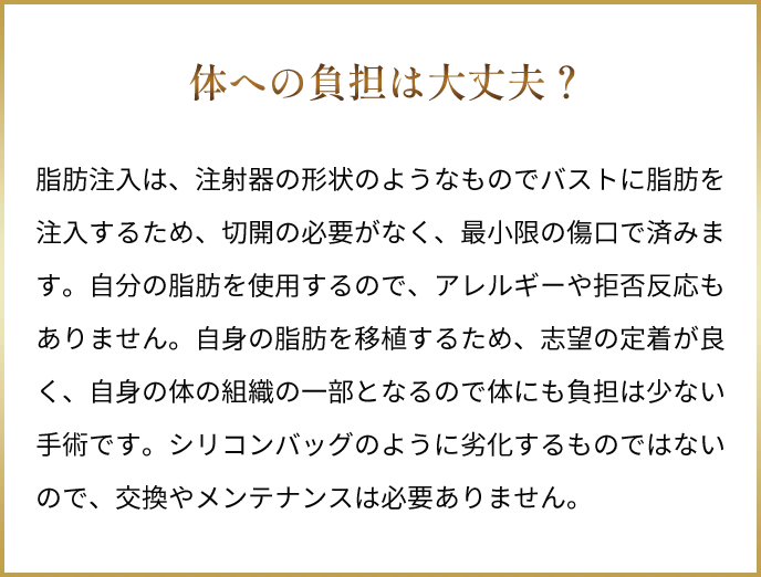 皮下脂肪の部分に脂肪を注入するため、母乳や授乳への影響はありません。